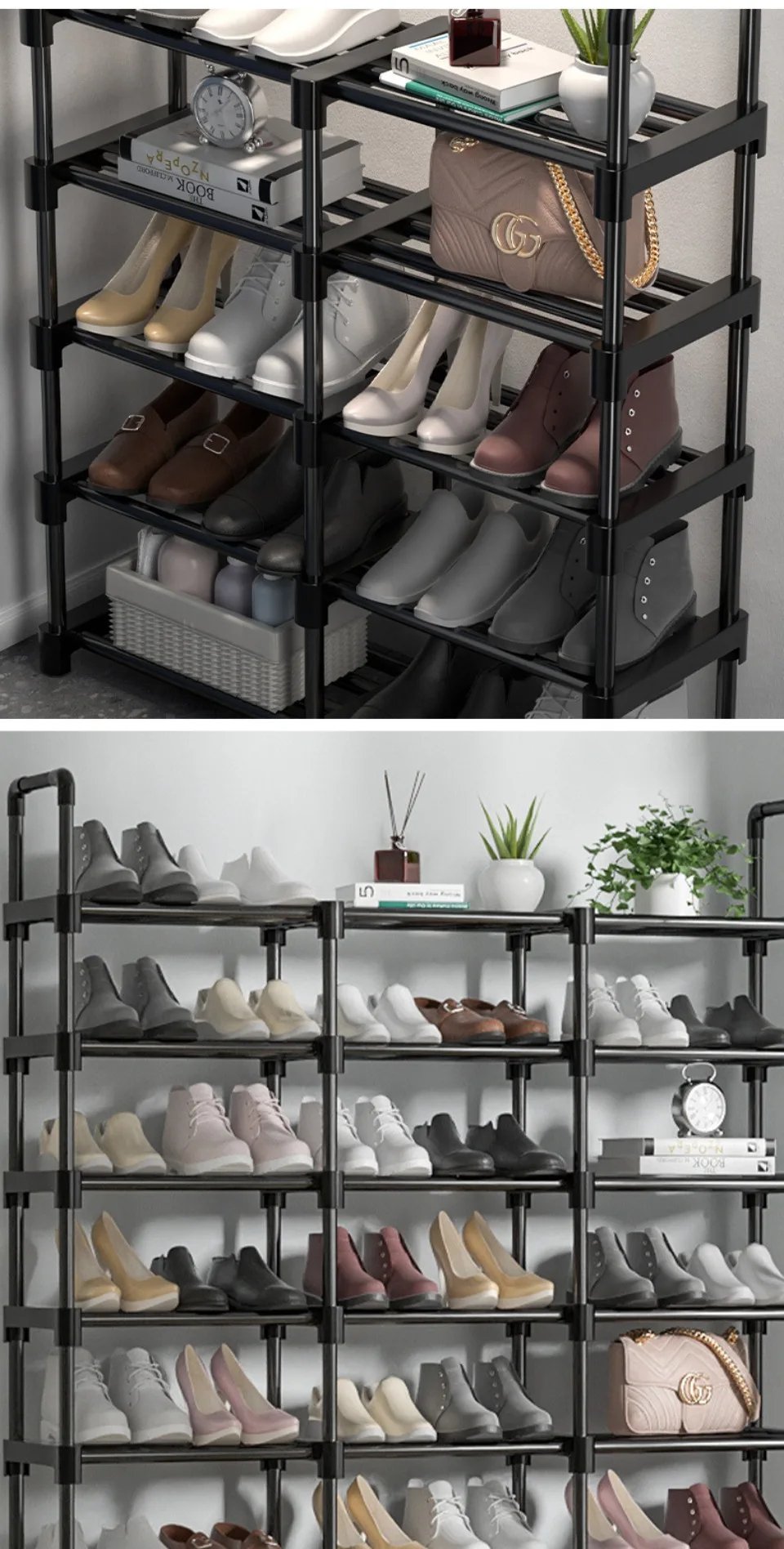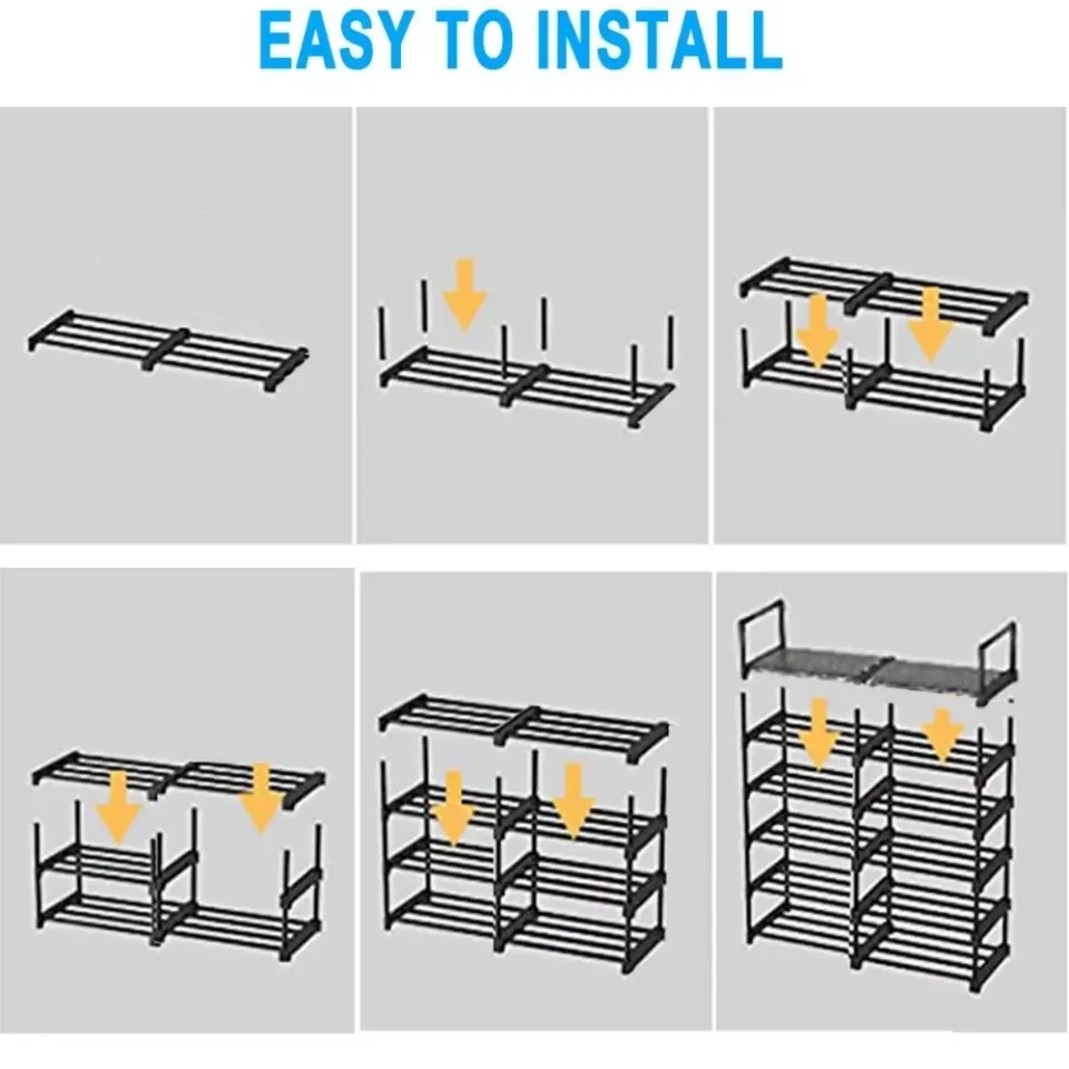 【Sturdy Metal】Consists of thickened metal tubes, waterproof PP tiers, and strengthened plastic connectors that make closet shoe rack organizer sturdy enough. Short design of shelf pipes are hard to bend even put larger and heavy objects, that makes this rack sturdier, stabler and longer lifetime.