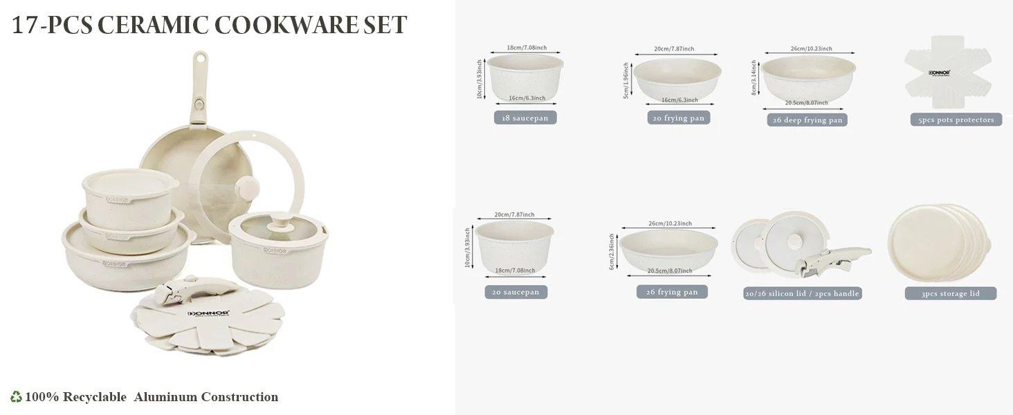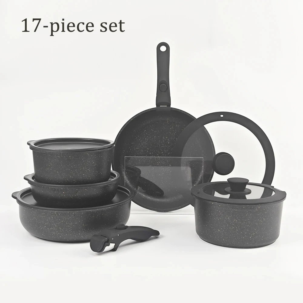 1. Sturdy European Standard Aluminum Alloy Body: The reinforced die-cast aluminum construction of cookware set ensures durability and reliability for long-term use while still maintaining a lightweight design.