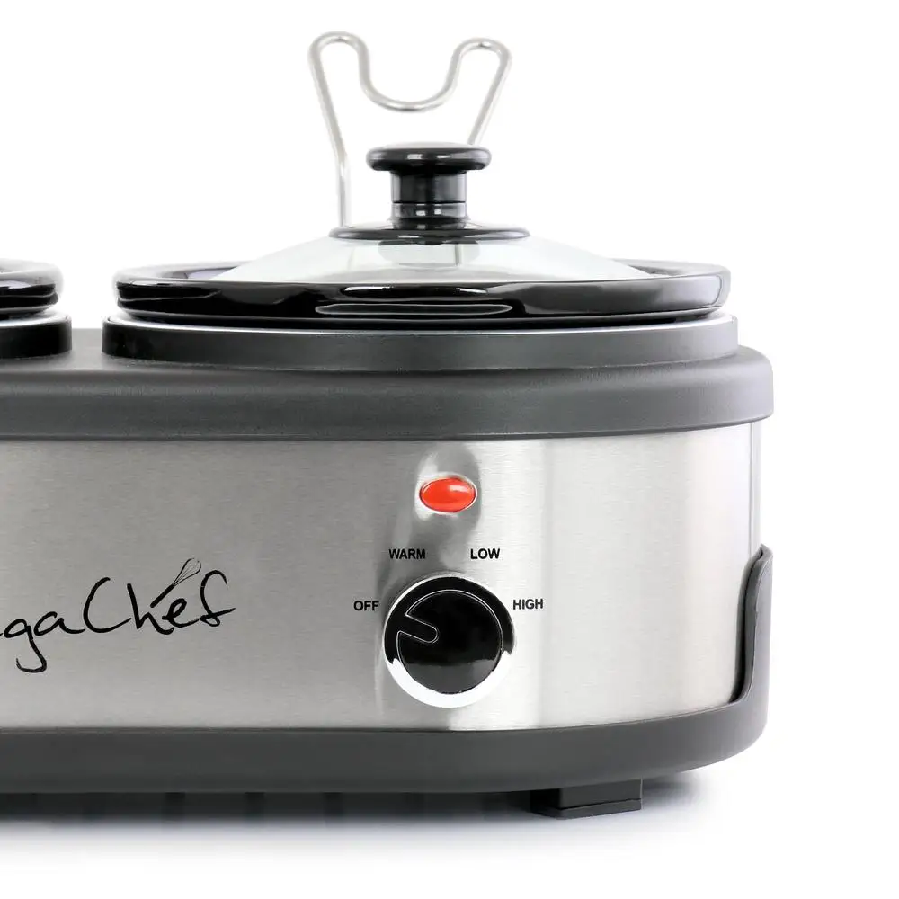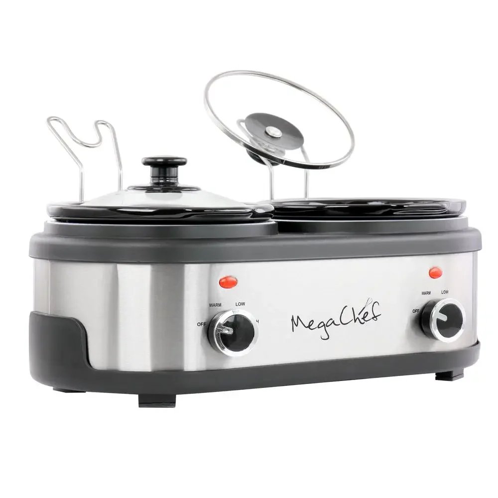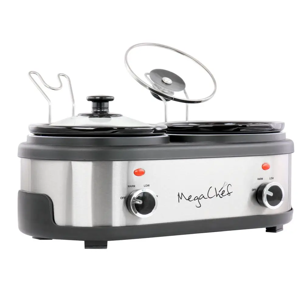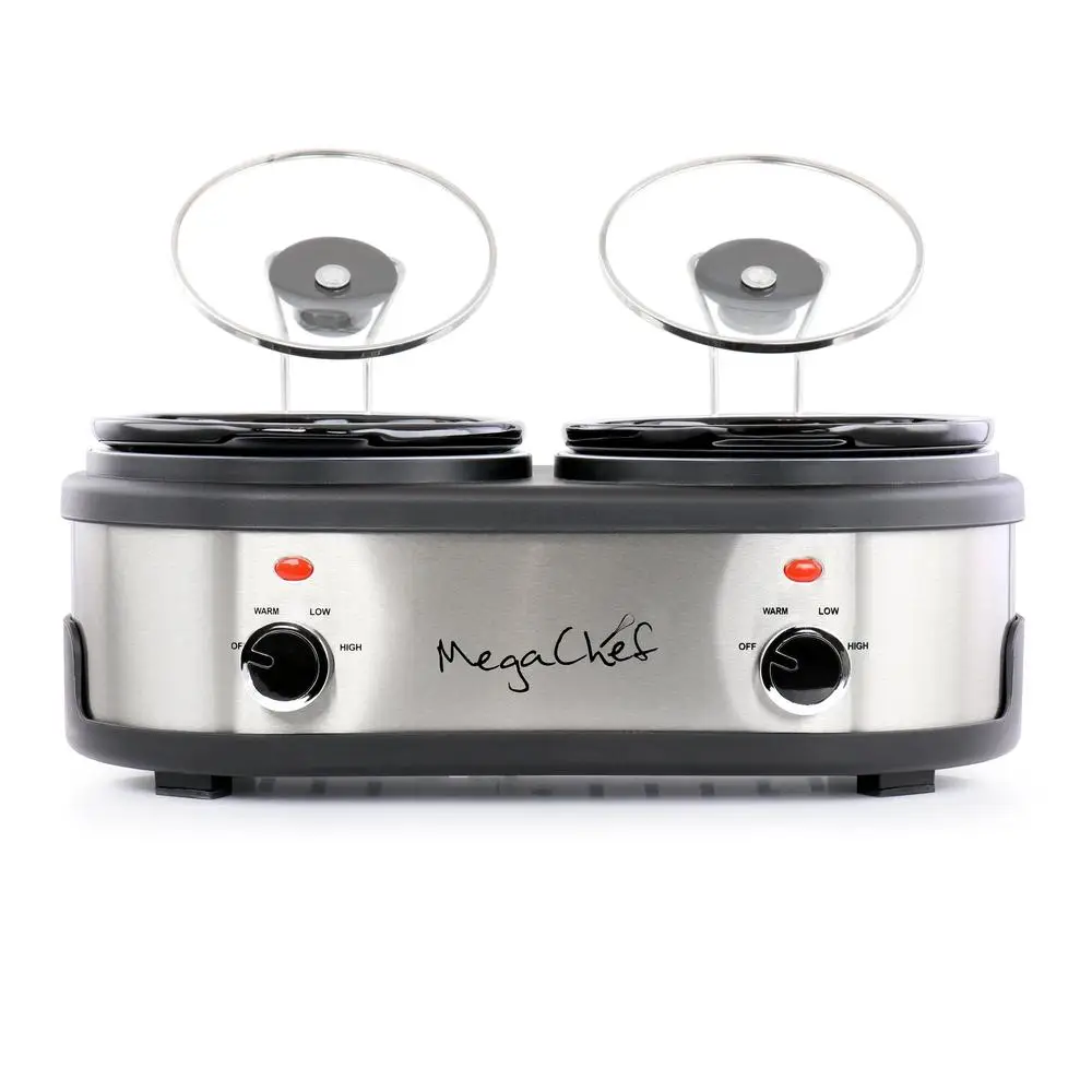 MegaChef’s Dual Slow Cooker Buffet Server will keep food warm, fresh and delicious all the time.  Cook and serve up two different dishes directly in the crocks and keep them warm for hours.  Featuring two 1. 5 Quart removable Ceramic crocks, this slow cooker also has dual function cooking knobs giving you the flexibility to cook two different meals at the same time.  See through glass lids, lid holders, non-skid rubber feet and the cool touch handles and knobs are perfect for entertaining guests.  Crocks and lids are dishwasher safe, allowing for more time to entertain and less fuss over cleaning.