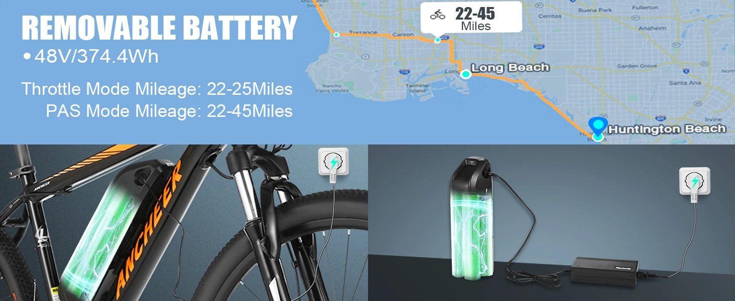 With the 48V 7.8Ah Lithium-Ion battery, you can reach a range of up to 22-50 milesPAS per charge. Plenty for a day’s adventure or most trips to travel and back.The range depends on the weight of the rider, the type of use, the gradient, outdoor temperature, etc.