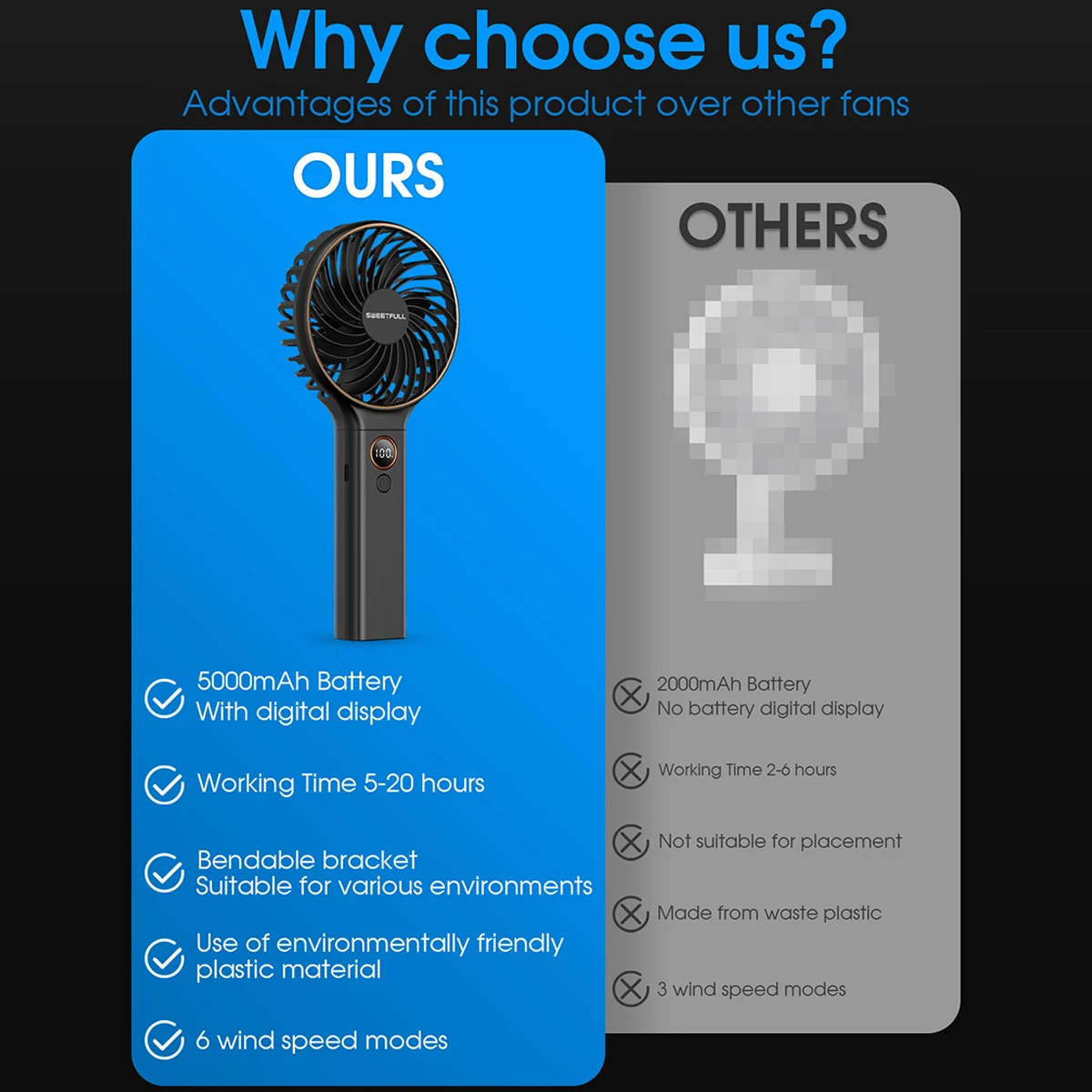 Easy to Clean: Detachable front cover for easy blade cleaning. Hand-held small fan, very suitable for use at home, office, travel, shopping, camping, easy to carry.
