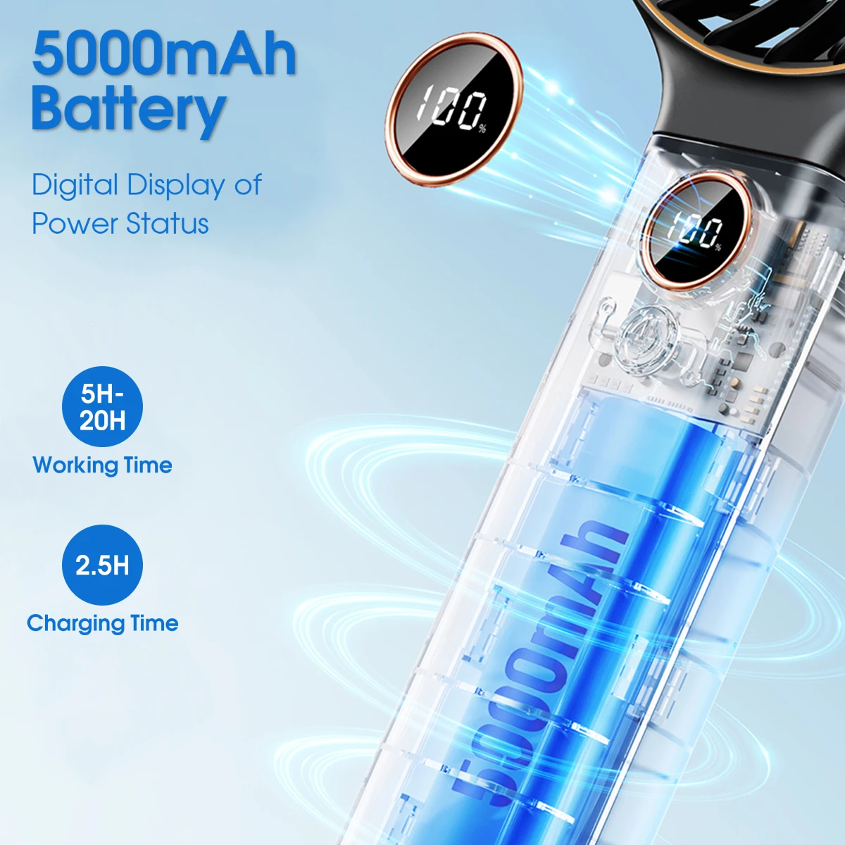 Long Working Time & Ultra-Quiet: Handheld fan with built-in 5000 mAh large-capacity battery, can work continuously for 5-20 hours depending on the gear. It only takes 2.5 hours to fully charge. Noise level is <15dB, ultra-quiet.