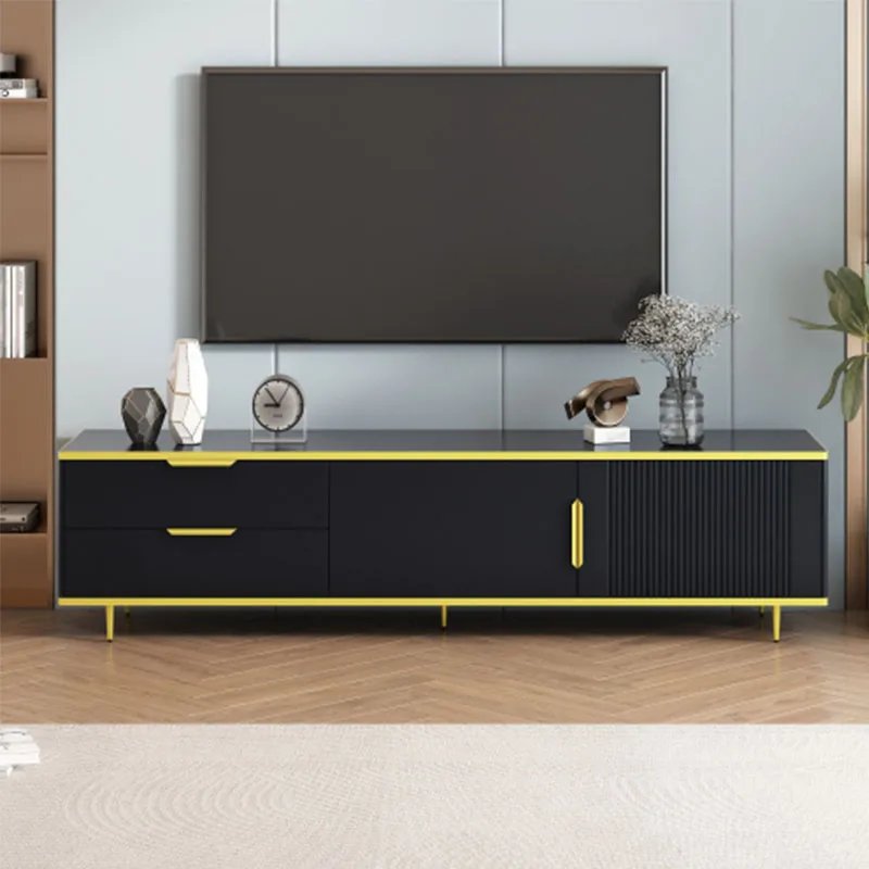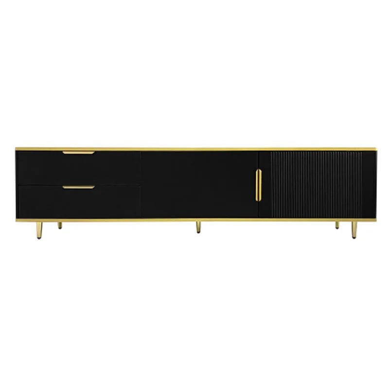The combination of modern and luxurious design, and meticulous craftsmanship makes this TV stand an exquisite addition to any living space. It is beautifully adorned with sleek curved handles, providing a comfortable and convenient opening and closing experience. The right cabinet door showcase a vertical grooved design, adding an element of craftsmanship. And the top and bottom boards embellished with gold trims, enhancing its overall aesthetic appeal. Including two storage cabinets and drawers, this TV stand offers ample space for storing your daily essentials, like books, CDs, blankets or media devices.
