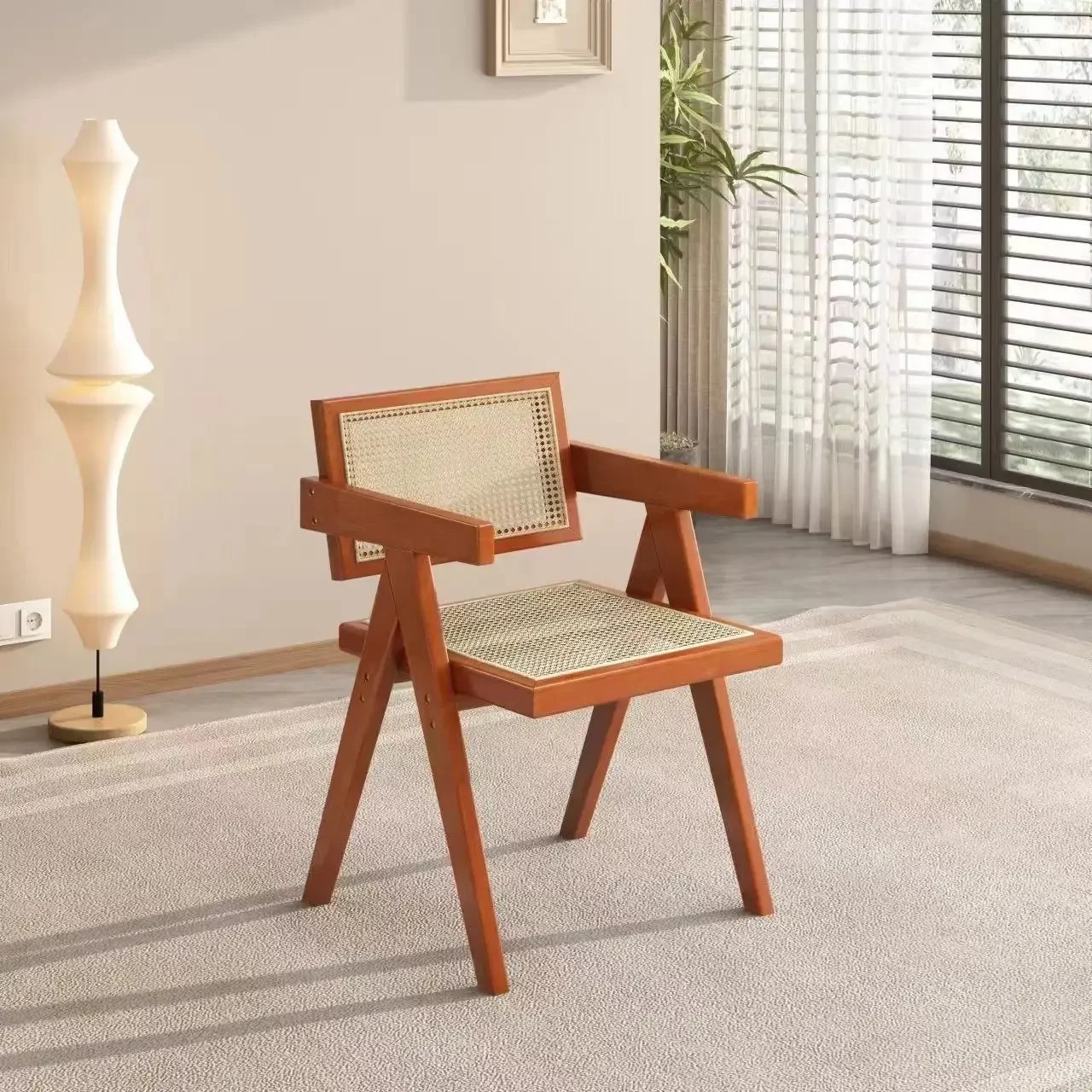 Modern Wooden Armchair with Rattan Design for Dining and Living Room Furniture Mid-Century Dining Chair with Wooden Legs