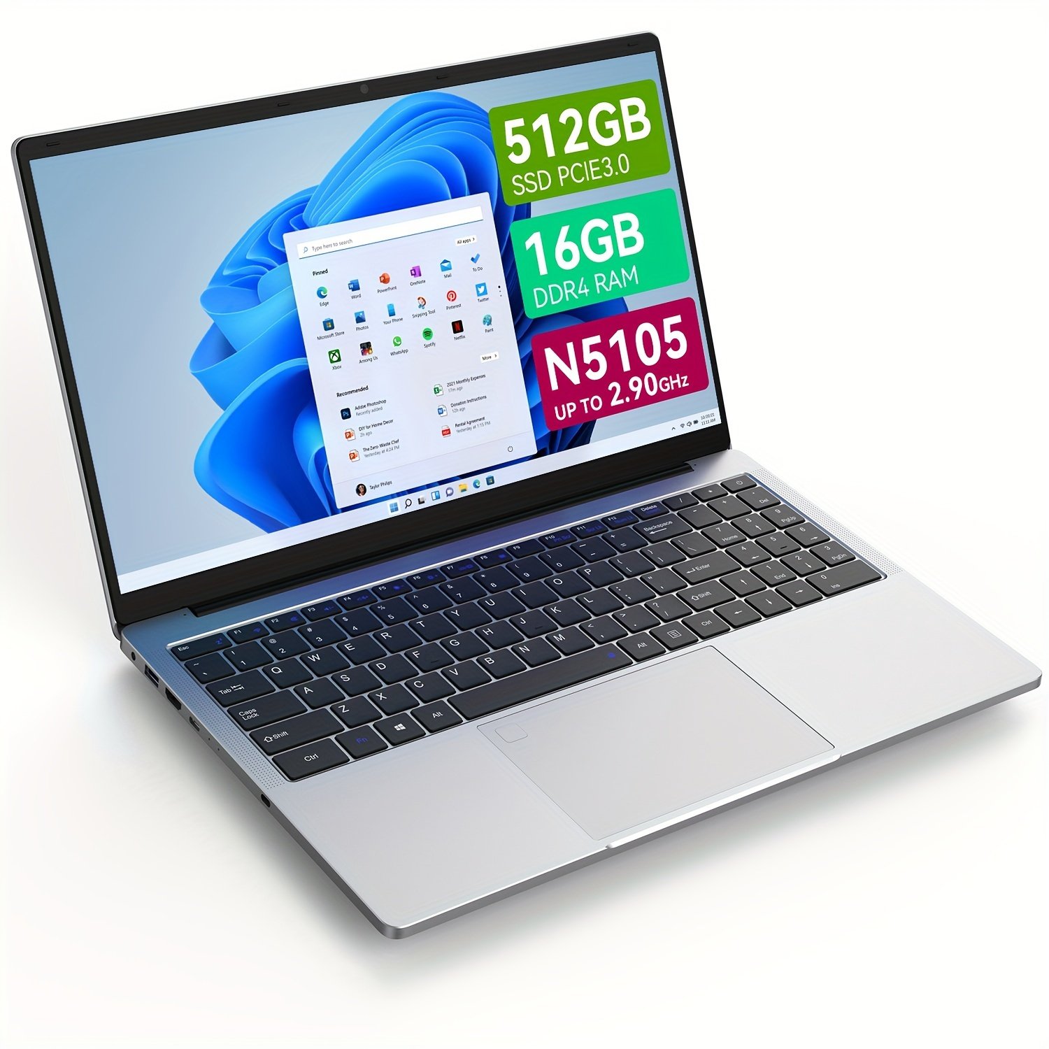 OTVOC Laptop Computer with 16GB for RAM, 512GB M.2 PCIe3.0 NVMe SSD, Intel N5105 2.0GHz Base Frequency2.9GHz Max Turbo Frequency Processor, 15.6&quote; FHD IPS LCD, 1920×1080, USB-A x3, RJ45 x1, USB-C x1, Windows 11