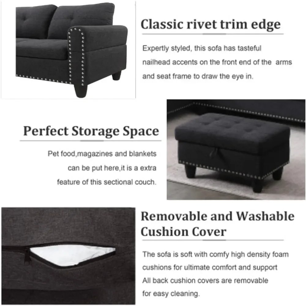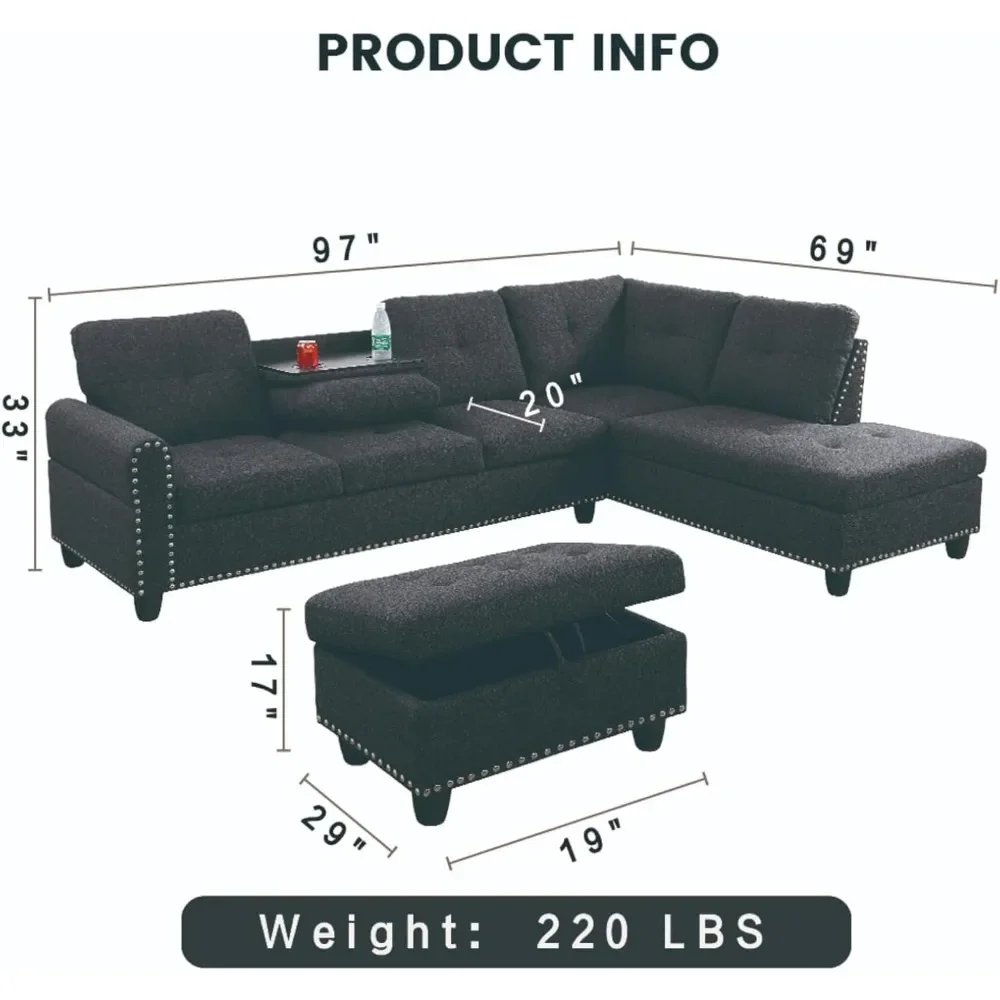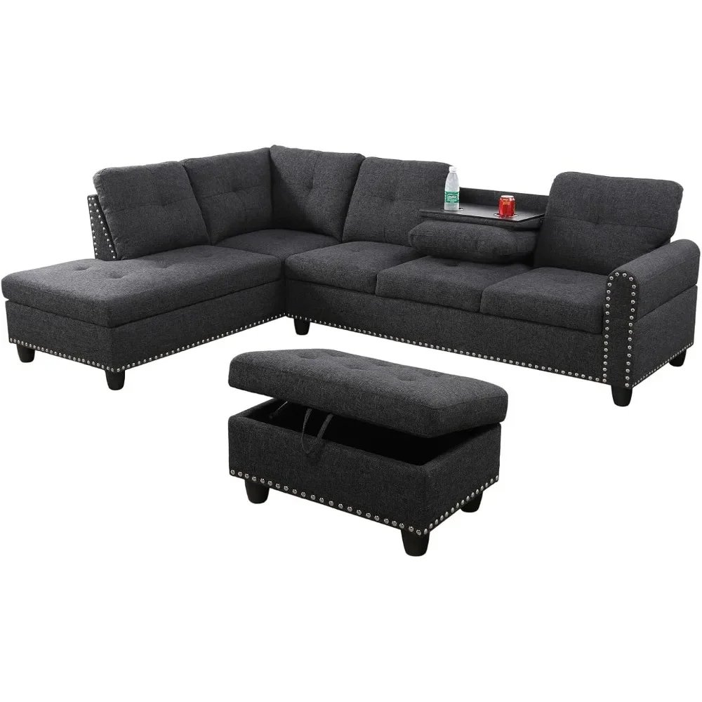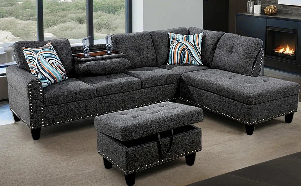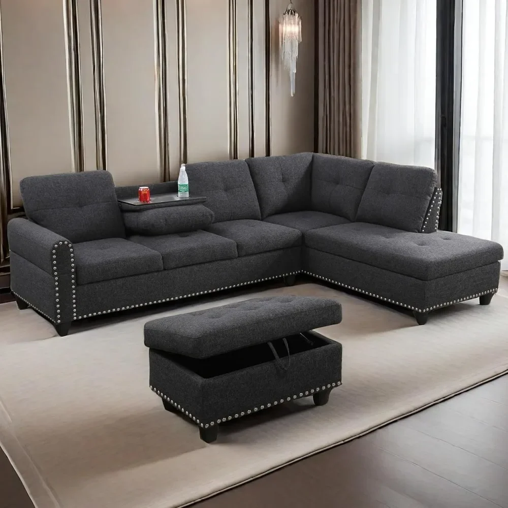 Sectional Sofa with Ottoman Nail-Head Design Linen Right Facing Modern Couches with Cup Holder L Shaped Sectional Sofa