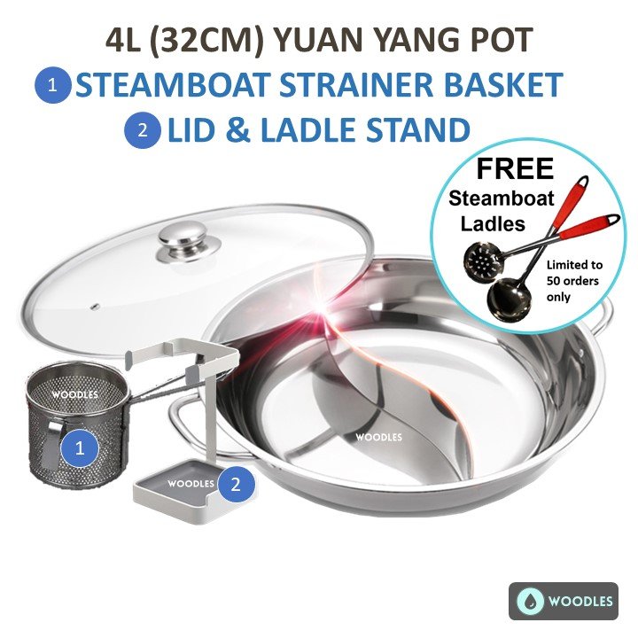 [SG Stock] WOODLES Yuan Yang Dual Steamboat Hotpot 4-Litre 32cm ★Glass Lid★Stainless Steel Induction Pot Divider★Local Shipping & Warranty