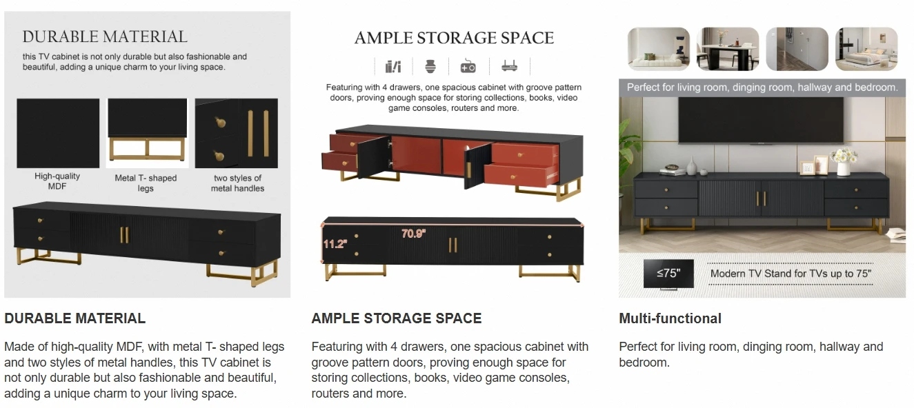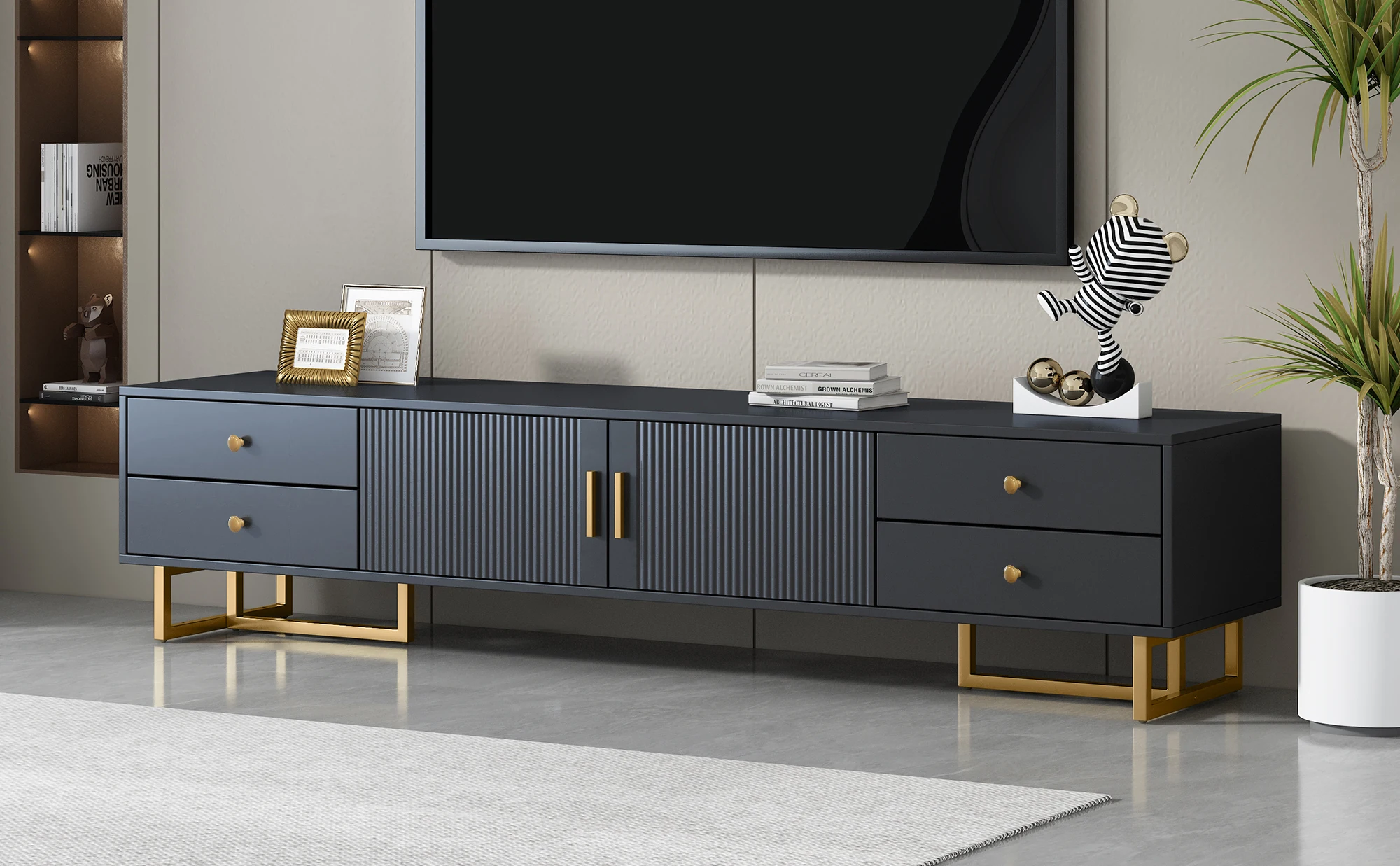 Whether you're looking for a stylish way to place your TV or you need a practical and versatile piece of furniture, this modern TV stand cabinet is sure to exceed your expectations. It comes with a unique wave groove design on its cabinet doors, giving it a contemporary look. It consists of a storage cabinet and four drawers, providing ample space for organizing various items. There are two types of metal handles included, adding a touch of elegance to the overall aesthetic. Constructed with sturdy and durable T-shaped metal frame, ensuring long-lasting use and stability.