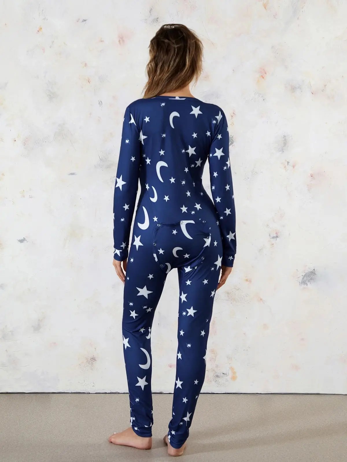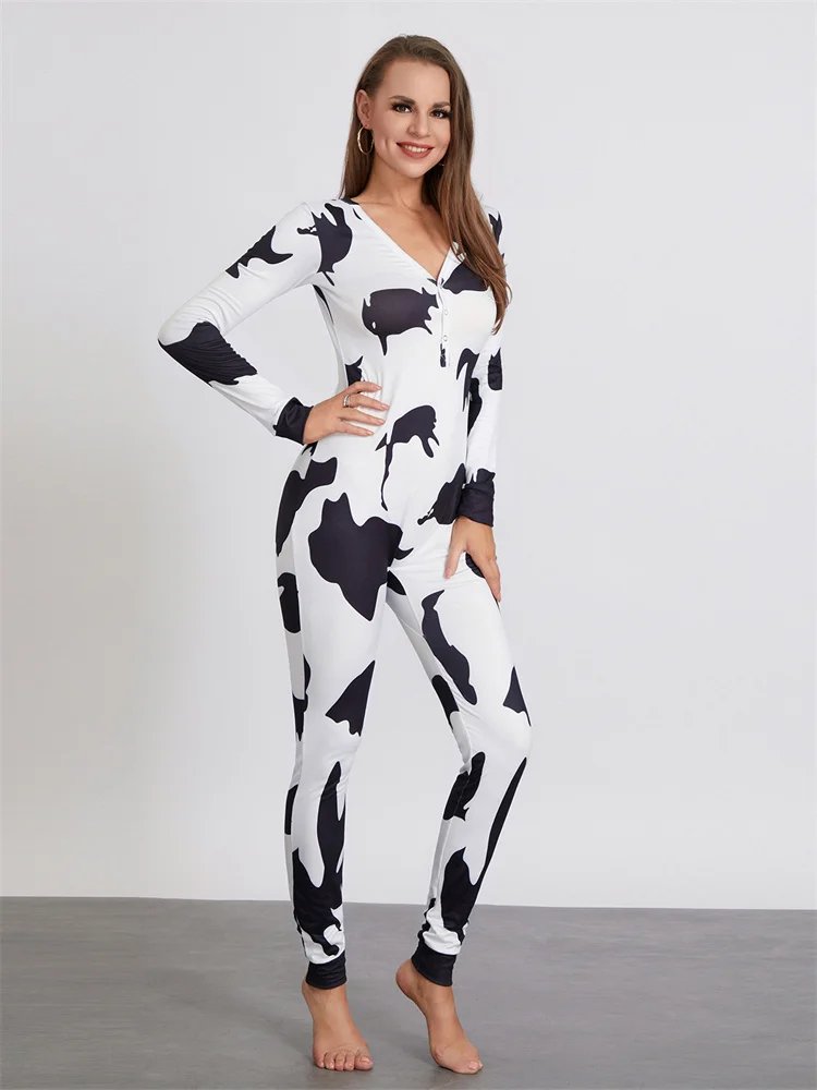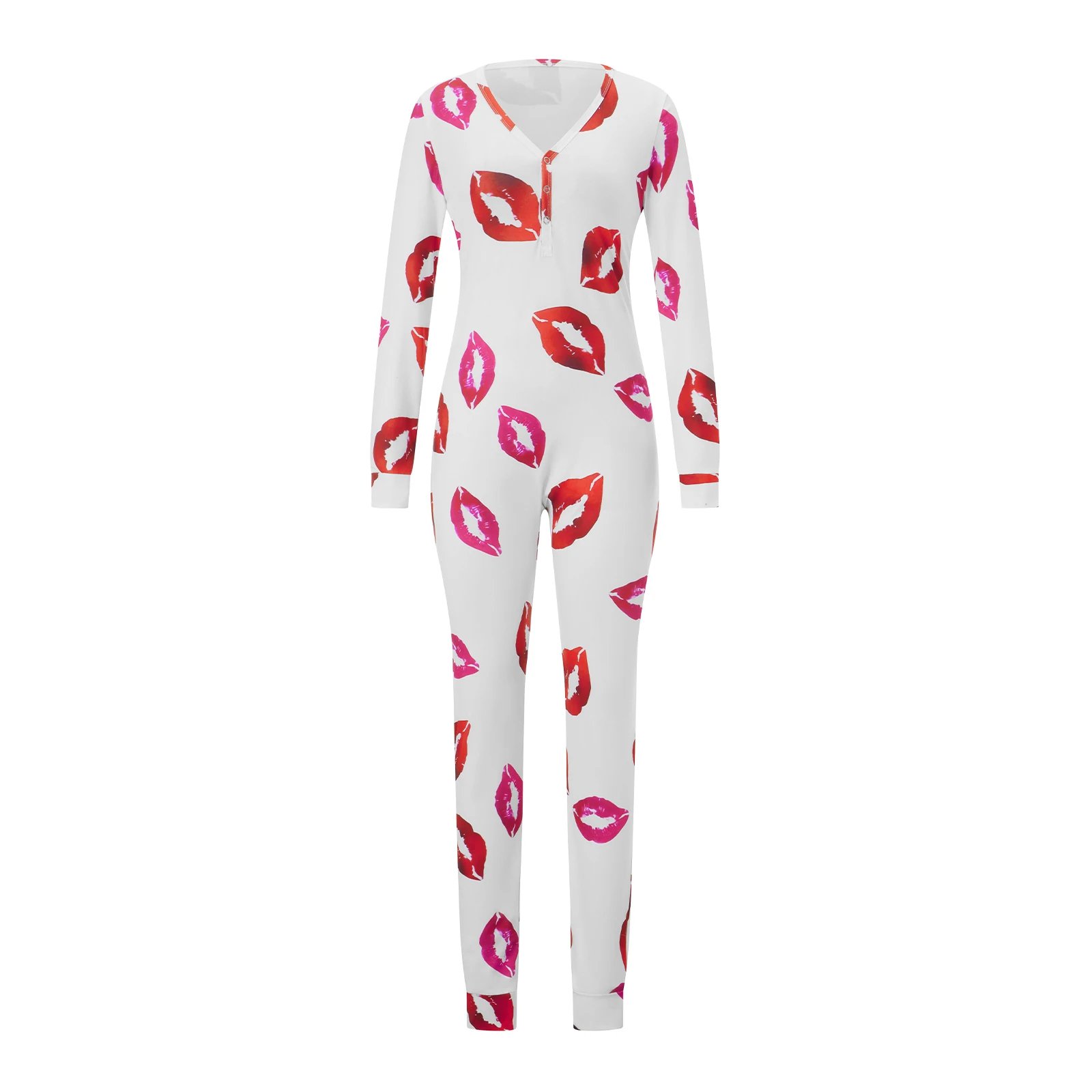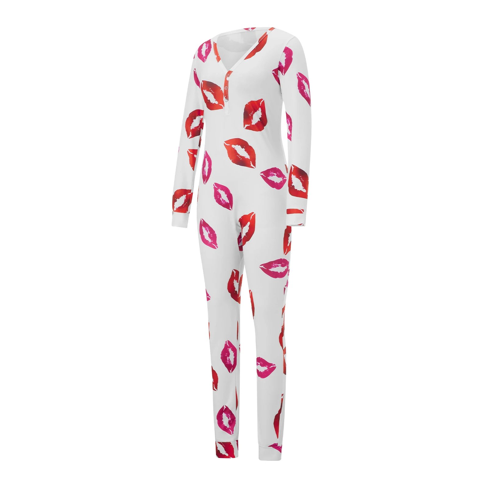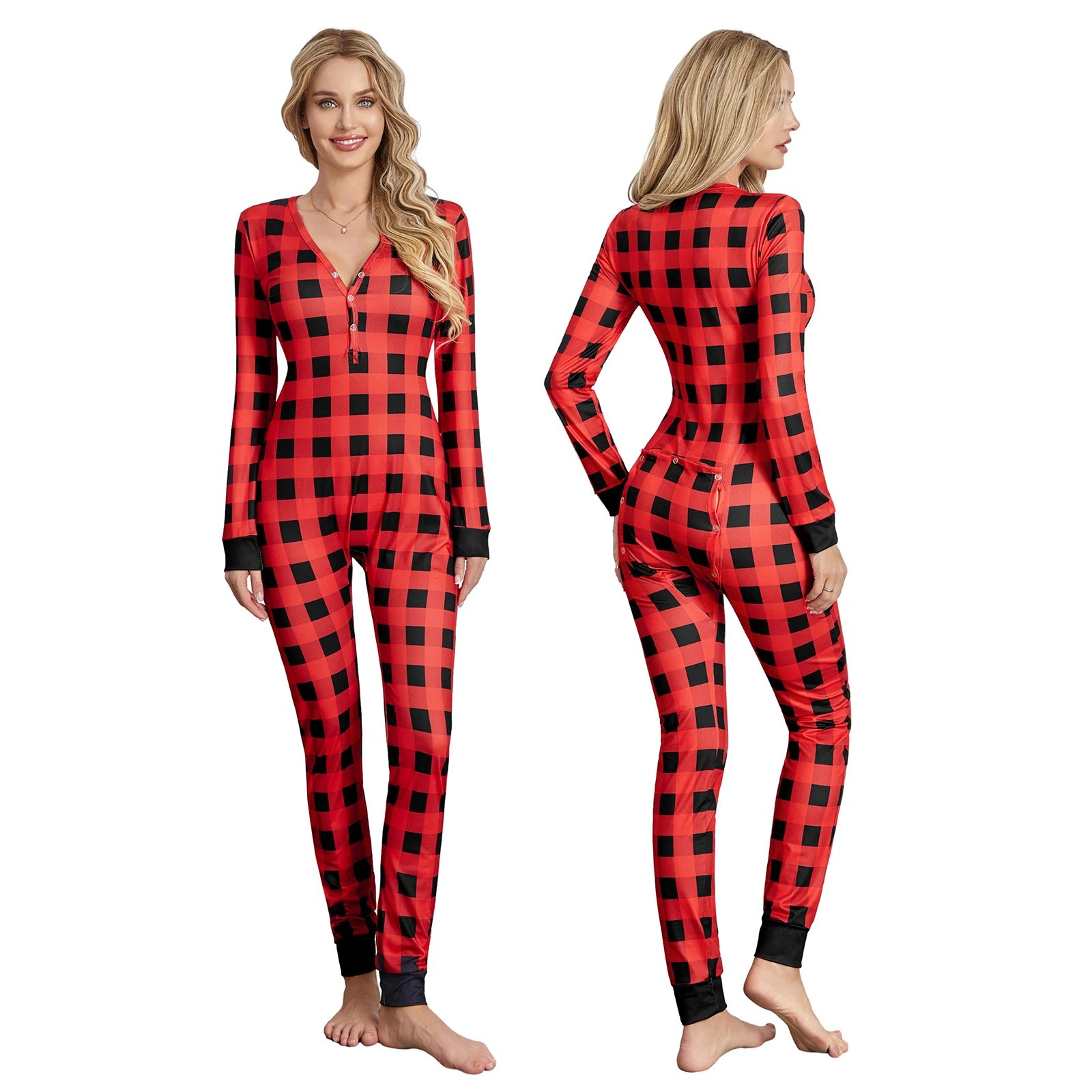Women Functional Buttoned Flap Jumpsuit Sleepwear, Solid Color / Printed Long Sleeve Homewear Pajamas