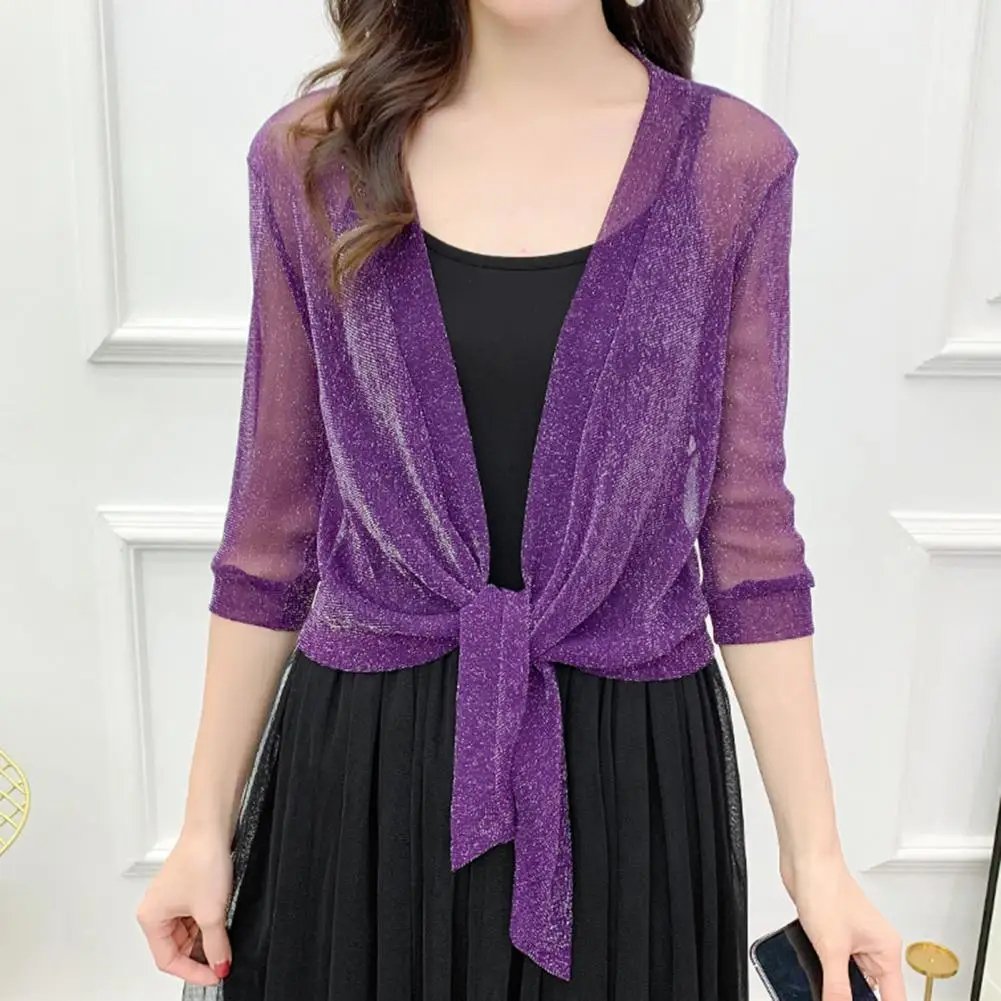 Women's Sheer Glitter Lace-up Cardigan Half Sleeve Summer Lightweight Jacket See-through Loose Blouse Women